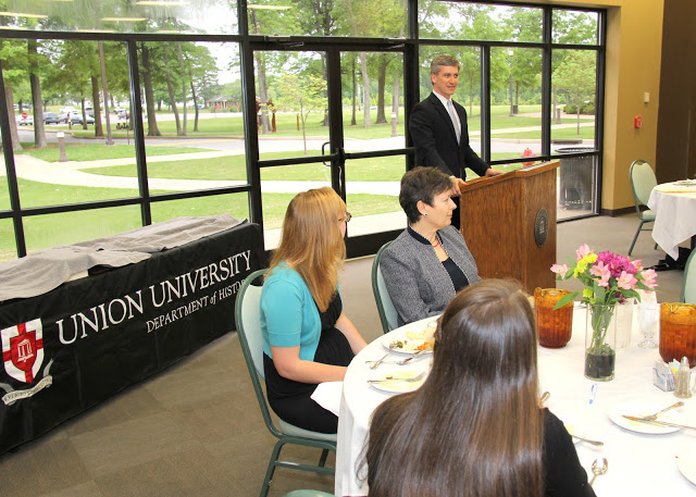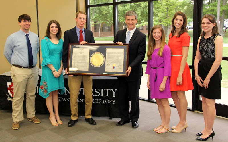 The history department held its annual awards banquet in Union University’s Coburn Dining Room on May 2, 2013. Some 45 people attended the event, where several students were recognized for outstanding work in history and for leadership in the department’s student organizations. The department also presented its Fifth Annual History Alumni Distinguished Achievement Award to Mr. Nelson Piercey for his long, successful career in education, both as a teacher and an administrator. Dr. Hal Poe, the Charles Colson Professor of Faith and Culture in Union’s School of Theology and Missions, was the evening’s featured speaker; he talked about Edgar Allan Poe and mystery writing. State Senator Lowe Finney made a special appearance at the event to present a framed copy of Tennessee Senate Joint Resolution No. 143 to Union’s Delta-Psi Chapter of Phi Alpha Theta History Honor Society; the resolution congratulates the chapter on its 60th anniversary in 2013. The Rutledge Honorary History Club, led by Dr. Terry Lindley, coordinated the banquet.
