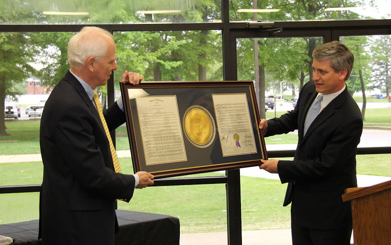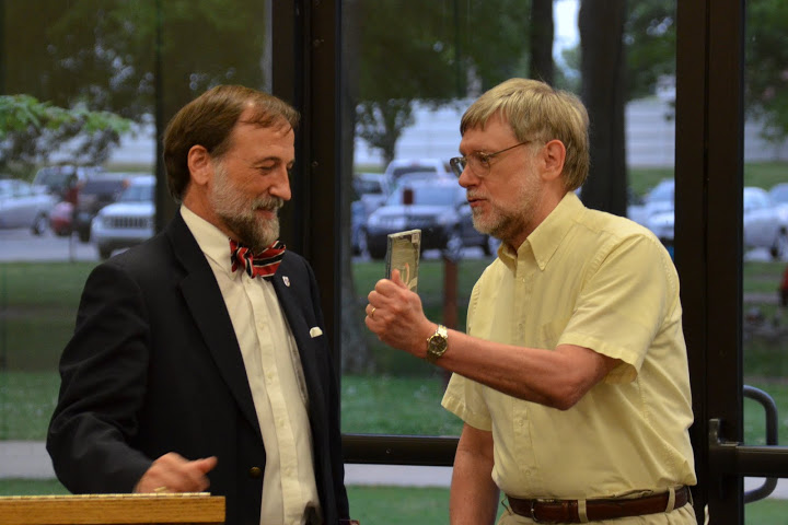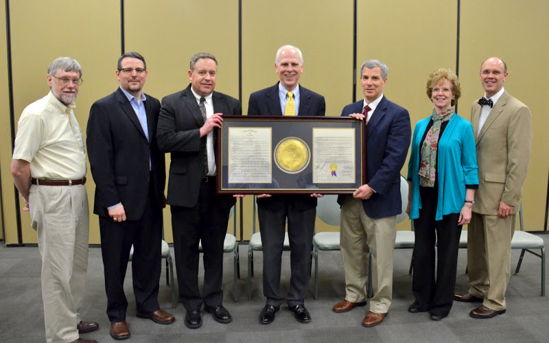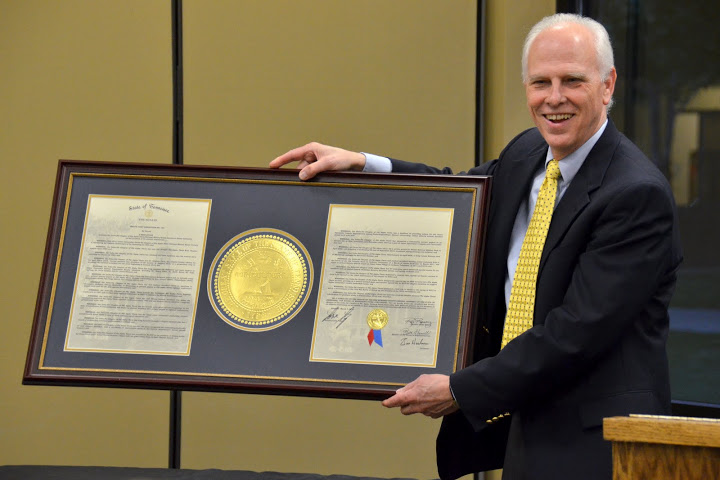 Dr. Stephen Carls (left) and State Senator Lowe Finney hold a framed copy of Senate Joint Resolution No. 143 that the 108th Session of the Tennessee Legislature passed to honor the Delta-Psi Chapter of Phi Alpha Theta History Honor Society on its 60th anniversary in 2013.