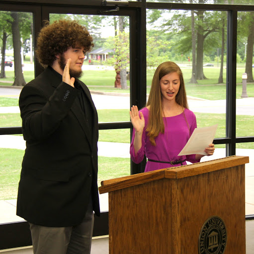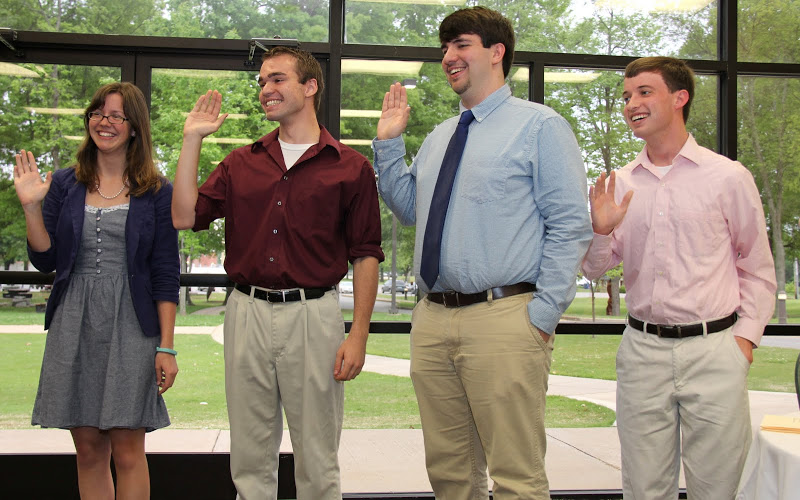 Rutledge Honorary History Club officers for 2013-2014 take their oath of office at the history department awards banquet on May 2, 2013. They are: (left to right) Bree McCuin, Colton Gebben, Charles Snow, and Luke Trammell.