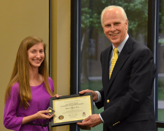 History major Mary Ellen Poe receives the Phi Alpha Theta Scholarship Pin and Academic Excellence Award from Dr. Stephen Carls on May 2, 2013. Photo by Morris Abernathy