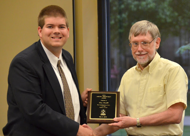 Will Miller (left) accepts a history department award for outstanding work in the history minor from Dr. Terry Lindley on May 2, 2013. Photo by Morris Abernathy