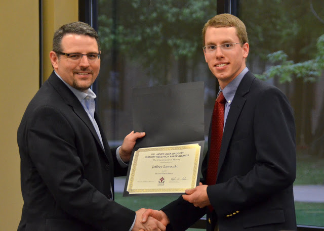 Dr. Keith Bates congratulates Jeffrey Lewoczko on May 2 for his success in winning second place in the 2013 Dr. James Alex Baggett History Research Paper Competition. Photo by Morris Abernathy