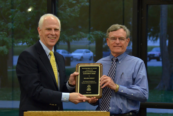 Dr. Stephen Carls (left) presnts the Fifth Annual Alumni Distinguished Achievement Award to Mr. Nelson Piercey at the history department awards banquet on May 2, 2013. Photo by Morris Abernathy