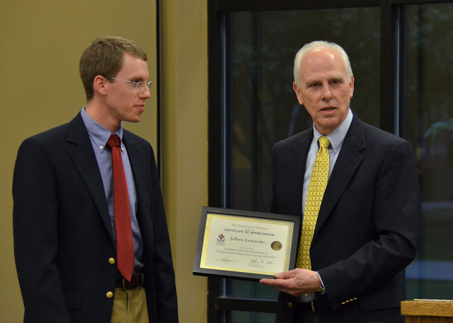 Dr. Stephen Carls presents a certificate of appreciation to Jeffrey Lewoczko at the history awards banquet on May 2, 2013, for his service as president of Union's Delta-Psi Chapter of Phi Alpha Theta in 2012-2013. Photo by Morris Abernathy