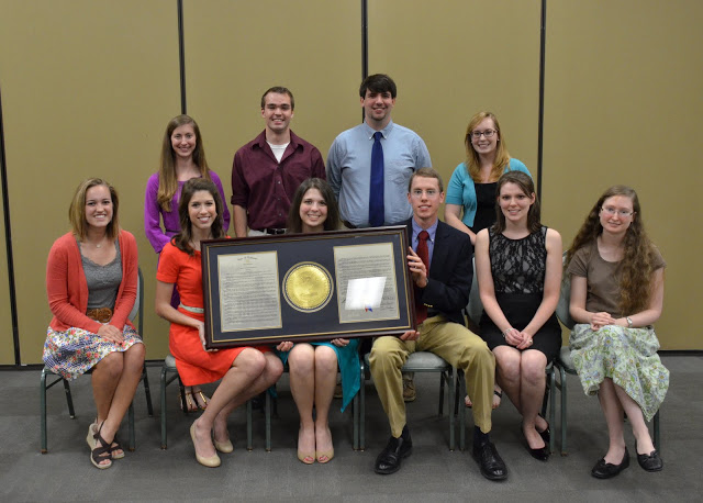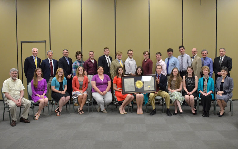 Phi Alpha Theta members join together for a group photo at the end of the history department awards banquet on May 2, 2013. The three Delta-Psi Chapter presidents from 2011 to 2014 hold the chapter's framed copy of Tennessee Senate Joint Resolution No. 143 that congratulates the chapter on the occasion of its 60th anniversary in 2013. Phi Alpha Theta members in the photo are: (seated, left to right) Dr. Terry Lindley, Mary Ellen Poe, Heather Stricklin, Allie Durham, Ginny Seger, Gracie Wise (president, 2013-2014), Caitlin Roach (president, 2011-2012), Jeffrey Lewoczko (president, 2012-2013), Patricia Dawson, Savannah German, Dr. Judy LeForge, and Dr. Alice-Catherine Carls; (standing, left to right) Dr. Stephen Carls, Dr. David Thomas, Dr. Keith Bates, Wil Sloan, Colton Gebben, Will Miller, Colby Benefield, Zach Thompson, Chad Buckley, Luke Trammell, Charles Snow, Logan Smith, Mr. Robert Briley, Mr. Nelson Piercey, and Dr. Henry Allen. Photo by Morris Abernathy