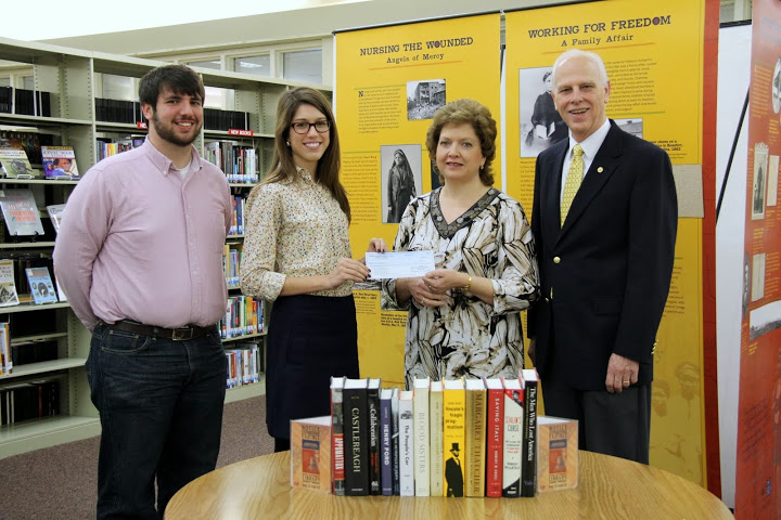 Gracie Wise (second from left), president of the Delta-Psi chapter of Phi Alpha Theta History Honor Society, presents a Best Chapter Award prize check to Union University Library Director Anna Beth Morgan on November 12, 2013. Chapter Vice President Charles Snow (left) and chapter faculty advisor Stephen Carls join with them on this special occasion. The $250 prize paid for the history books on display in the foreground. Photo by Anne Richoux
