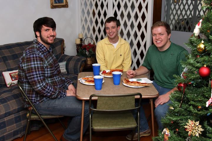 History club members Charles Snow (left to right), Luke Trammell, and Colby Benefield prepare to enjoy some pizza at Dr. Terry Lindley's home on December 2, 2013.