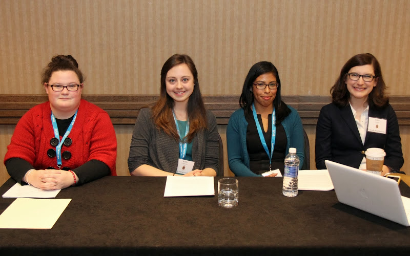 Union University paper presenter Shelby Pace (left) awaits the start of her panel on "Cuban and Mexican History" on January 3, 2014, at the Phi Alpha Theta Biennial Convention in Albuquerque, New Mexico. Other panel members are: (second from left and moving right) paper presenter Emily Anderson of Wake Forest University; paper presenter Brenda Ruiz Valle of California State University-Dominguez Hills; and panel chair/commentator Erika Jackson of Colorado Mesa University.
