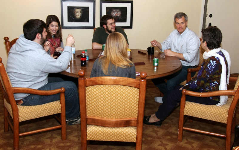 Faculty and students enjoy conversing with each other as they prepare to play a game of Scrabble on the evening of January 3, 2014, at the Phi Alpha Theta Biennial Convention in Albuquerque, New Mexico. They are: (starting on the left and going clockwise) Charles Snow, Gracie Wise, Lowell Van Ness, Dr. David Thomas, Dr. Alice-Catherine Carls, and Heather Stricklin (back to camera).