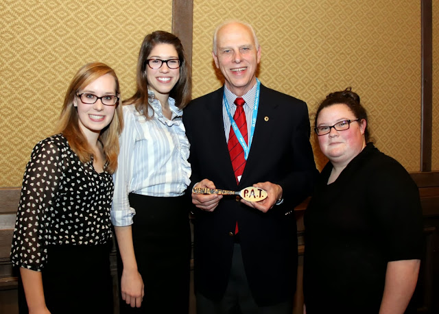 Dr. Stephen Carls, holding the Phi Alpha Theta presidential spoon of authority, stands with Union students Heather Stricklin (left to right), Gracie Wise, and Shelby Pace following the Presidential Banquet on January 4, 2014 at the Phi Alpha Theta convention in Albuquerque, New Mexico.