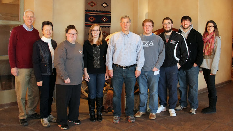 The members of the Union University contingent join together for a photo prior to their departure from the Tamaya Resort on the morning of January 5, 2014 to head back to Tennessee. They are: (left to right) Dr. Stephen Carls, Dr. Alice-Catherine Carls, Shelby Pace, Heather Stricklin, Dr. David Thomas, Colby Benefield, Lowell Van Ness, Charles Snow, and Gracie Wise.