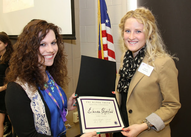 Elaura Highfield (right), a 2012 Union University history graduate and now a graduate student at Middle Tennessee State University, stands with Tennessee Tech student Whitney Carr who presents her with the first place award for graduate papers at the Phi Alpha Theta regional conference luncheon on February 22, 2014.