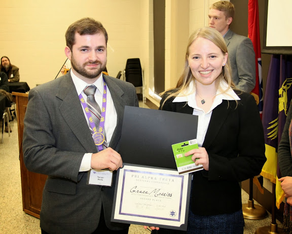 Grace Morriss, the winner of a second-place award for undergraduate papers, stands with Tennessee Tech student Tanner Wells who presents her with the prize at the Phi Alpha Theta regional conference luncheon on February 22, 2014.