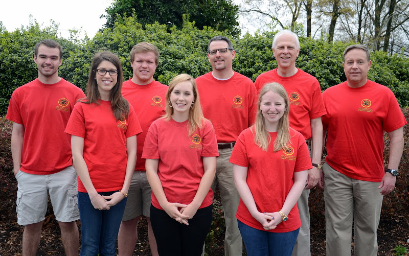 Phi Alpha Theta members who are graduating seniors join with history faculty members for a photos during the Delta-Psi chapter's Red T-shirt Spirit Day on April 15, 2014. They are: (front row, left to right) Gracie Wise, Heather Stricklin, and Grace Morriss; (back row, left to right) Colton Gebben, Colby Benefield, Dr. Keith Bates, Dr. Stephen Carls, and Dr. Henry Allen. Photo by Jacob Moore