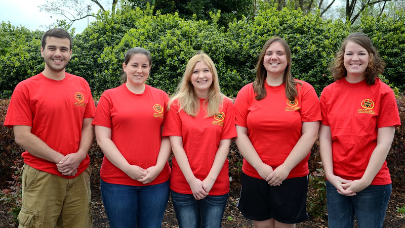 The 2014-2015 Delta-Psi chapter officers pause for a photo during the chapter's annual Phi Alpha Theta Red T-shirt Spirit Day on April 15, 2014. They are: (left to right) Allen Bradley, senator; Faith Bagley, president; Hannah Jones, vice president; Kensie Zills, senator; and Sarah Carroll, secretary. Photo by Jacob Moore
