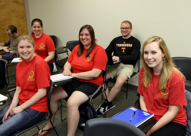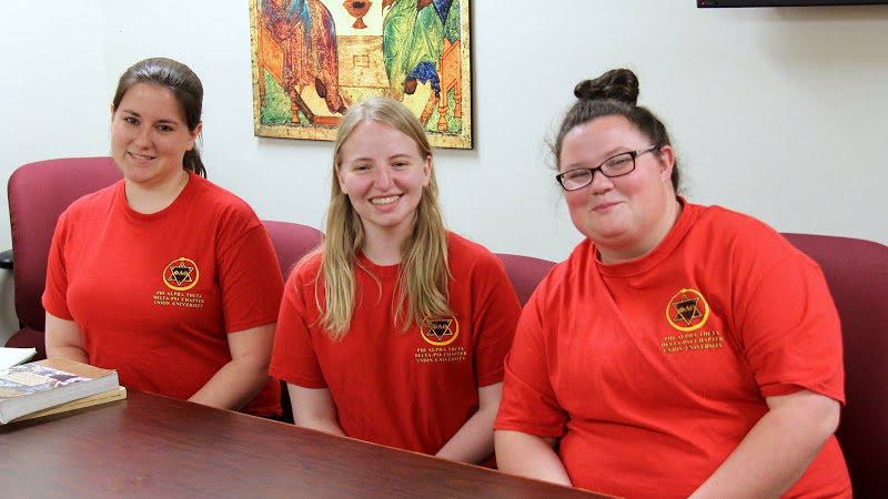 Union University Phi Alpha Theta members, wearing their Delta-Psi chapter T-shirts for the society's Spirit Day on April 14, 2014, wait for a history class to begin. They are: (left to right) Hannah Jones, Faith Bagley (behind Jones), Kensie Zills, and Heather Stricklin.