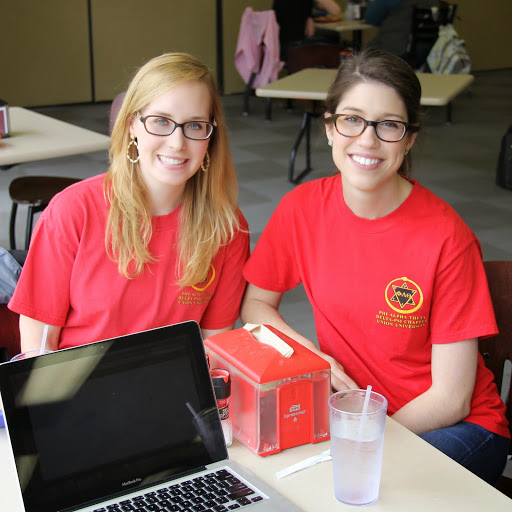 Phi Alpha Theta members Heather Stricklin (left) and Gracie Wise pause for a photo at lunchtime in Union University's cafeteria on April 14, 2014. They are wearing their Delta-Psi chapter T-shirts as a part of the history honor society's annual Spirit Day.
