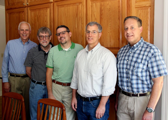 History department members join together for a photo during a working lunch on August 12, 2014. They are: (left to right) Drs. Stephen Carls, Terry Lindley, Keith Bates, David Thomas, and Henry Allen.