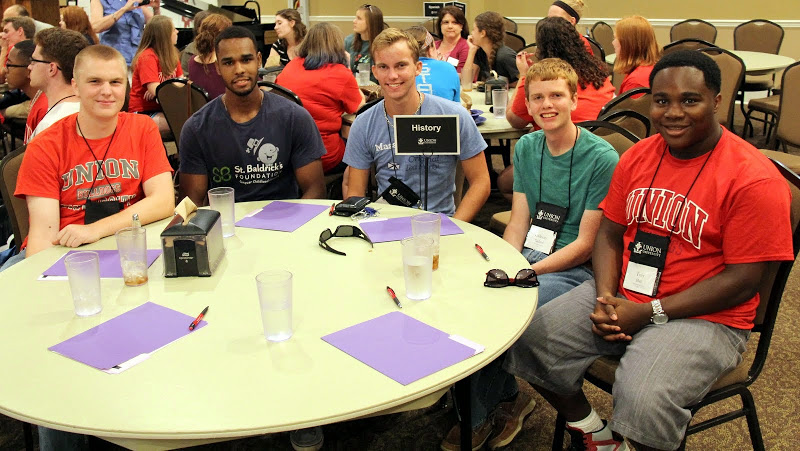 Students seated at the history department table for the New Student Dinner on August 16, 2014, are: (left to right) Nathan Van Neste, Jordan Montgomery, Seth Reid, Gideon Ragland, and Trey Hall.