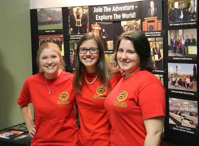 Leaders of the history department's two student organizations take time out from their work at the Student Organizations Fair on August 18, 2014, for a photo. They are: (left to right) Phi Alpha Theta Vice President Hannah Jones, Rutledge Honorary History Club President Bree McCuin, and Phi Alpha Theta President Faith Bagley.