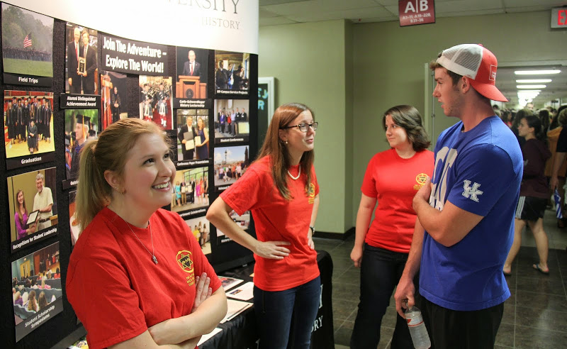 History student club leaders Hannah Jones (left to right), Bree McCuin, and Faith Bagley serve as greeters at the history department display booth during the Student Organizations Fair on August 18, 2014.