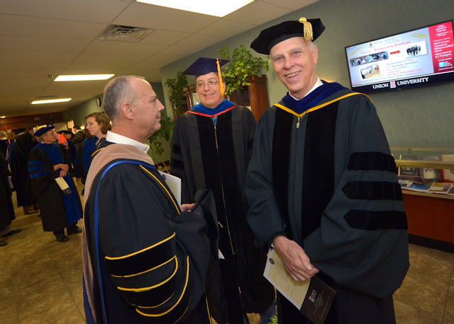 Faculty members get ready for the processional at Union University's annual fall convocation on August 22, 2014. In the foreground are: (left to right) Dr. William Nance of the School of Business Administration, Dr. Randy Johnston of the chemistry department, and the history department's Dr. Stephen Carls. Photo by Morris Abernathy