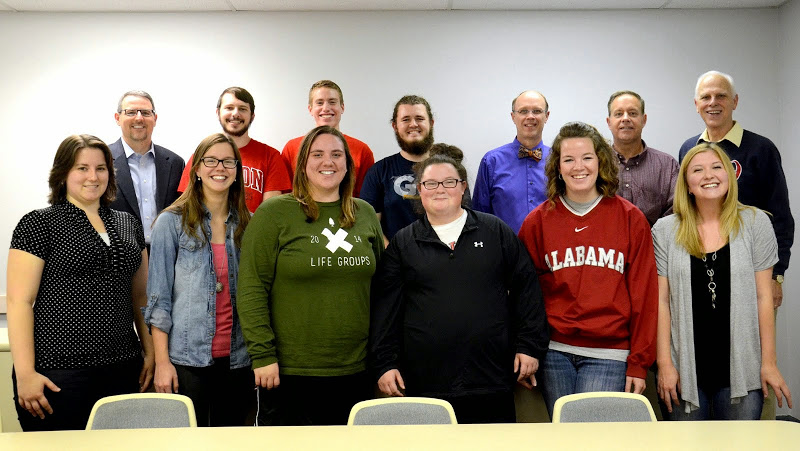 Phi Alpha Theta members join together for a photo at the Delta-Psi chapter's fall initiation/plenary meeting on September 15, 2014. They are: (front row, left to right) Faith Bagley, Bree McCuin, Kensie Zills, Shelby Pace, Sarah Carroll, and Hannah Jones; (back row, left to right) Dr. Keith Bates, Hunter Hawes, Stephen Lewoczko, Nick Hancock, Robert Briley, Dr. Henry Allen, and Dr. Stephen Carls. Photo by MiKalla Cotton