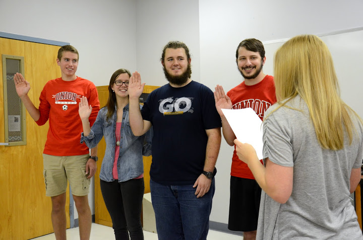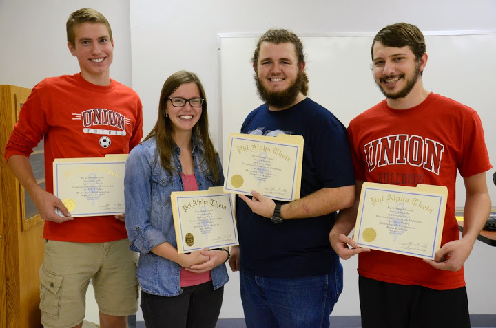 Union’s Delta-Psi chapter of Phi Alpha Theta History Honor Society inducted four new members at its fall initiation/plenary meeting on September 15, 2014. Chapter Vice President Hannah Jones conducted the ceremony for Nick Hancock, Hunter Hawes, Stephen Lewoczko, and Bree McCuin, and President Faith Bagley presented them with their certificates of membership. A fifth new member, Nathan Handley, was unable to attend.
