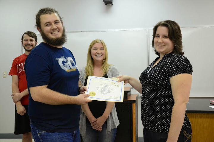 Nick Hancock receives his Phi Alpha Theta certificate of membership from Delta-Psi Chapter President Faith Bagley during the chapter meeting on September 15, 2014. Hunter Hawes (left background) and Vice President Hannah Jones (second from right) celebrate the presentation with smiles. Photo by MiKalla Cotton