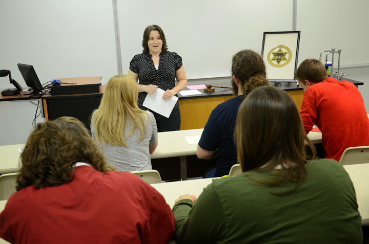 Phi Alpha Theta President Faith Bagley makes announcements at the Delta-Psi chapter's fall intiation/plenary meeting on September 15, 2014. Photo by MiKalla Cotton