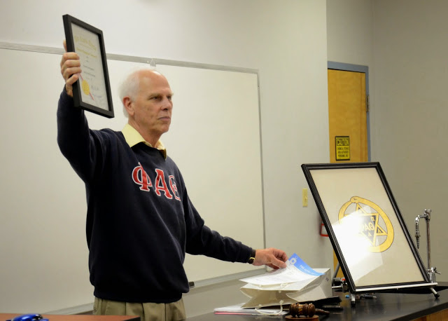 Dr. Stephen Carls holds up the Delta-Psi chapter's latest Phi Alpha Theta Best Chapter Award certificate during the society's meeting on September 15, 2014. Photo by MiKalla Cotton