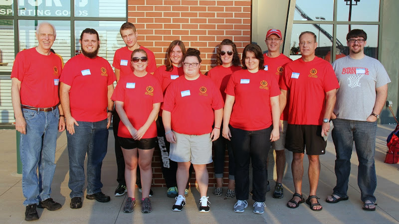 Delta-Psi chapter volunteers for the "Racing So They Can Ride" event on September 20, 2014, join for a photo prior to the running events. They are: (front row, left to right) Dr. Stephen Carls, Nick Hancock, Hannah Jones, Shelby Pace, Faith Bagley, Dr. Henry Allen, and Charles Snow; (back row, left to right) Stephen Lewoczko, Kensie Zills, Sarah Carroll, and Robert Briley.