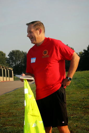 Phi Alpha Theta member Robert Briley (left) cheers on runners during the "Racing So They Can Ride" event on September 20, 2014.