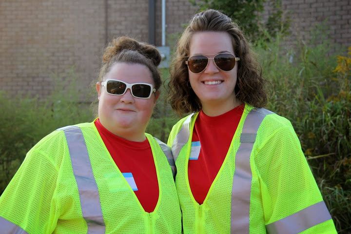 Shelby Pace (left) and Sarah Carroll relax at their assigned volunteer station prior to the start of the "Racing So They Can Ride" event on September 20, 2014.