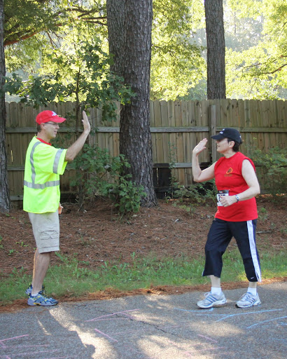 Phi Alpha Theta member Robert Briley prepares to give a high-five to fellow society member and race participant Dr. Alice-Catherine Carls during the "Racing So They Can Ride" event on September 20, 2014.