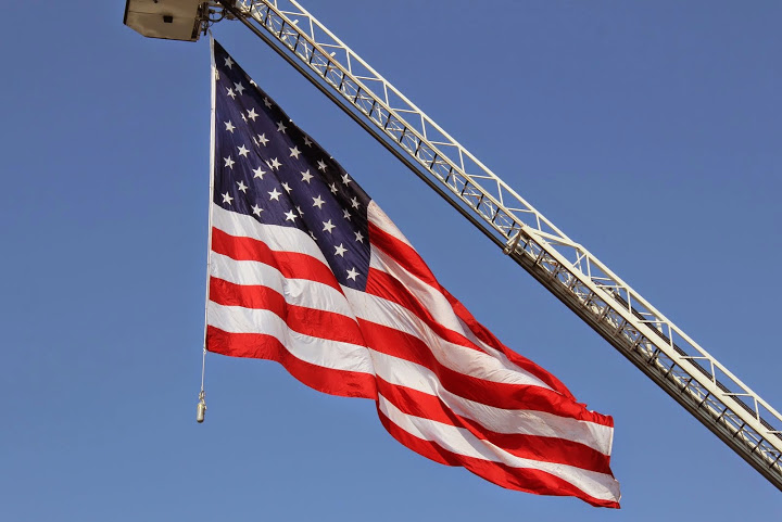 An American flag flies high in the sky at the finish line at Dick's Sporting Goods in Jackson for the "Racing So They Can Ride" event on September 20, 2014.