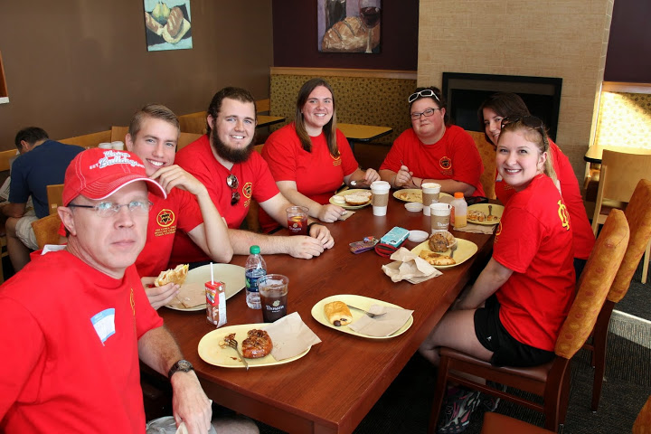 Phi Alpha Theta volunteers at the "Racing So They Can Ride" event on September 20, 2014, enjoy breakfast together at Panera Bread after the races. They are: (left to right, going clockwise) Robert Briley, Stephen Lewoczko, Nick Hancock, Kensie Zills, Shelby Pace, Faith Bagley, and Hannah Jones.