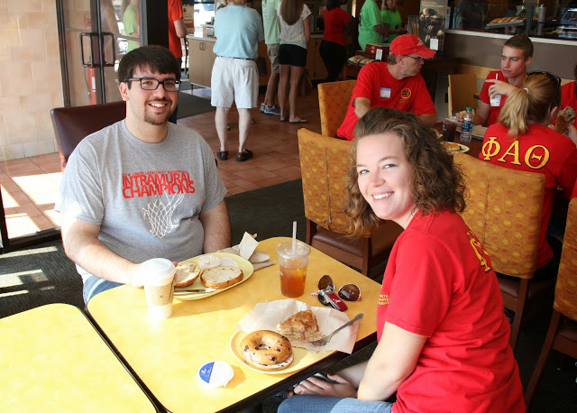 Phi Alpha Theta volunteers Charles Snow and Sarah Carroll enjoy breakfast at Panera Bread following the "Racing So They Can Ride" event on September 20, 2014.