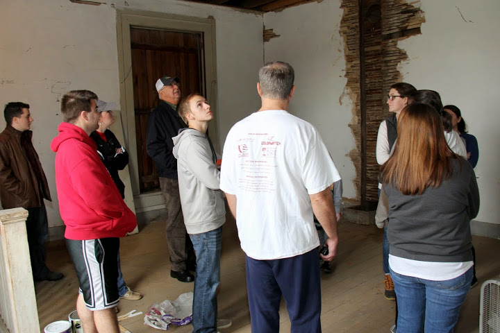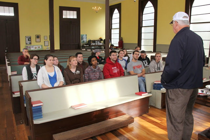 Participants in the Phi Alpha Theta/History Department community service project in Denmark, Tennessee, sit in the Denmark Presbyterian Church as they listen to Billy King, president of the Big Black Creek Historical Association, talk about the church's history. They are: (front row, left tor right) Faith Bagley, Hannah Jones, Brittanee Boler, Kenan Keller, Allen Bradley, and Devin Dean; (second row, left tor right) Livvy Winters, Kathryn Mitchell, Nic Linn, Jordan Sellers, and Dr. Keith Bates; (third row, left to right) Sarah Carroll (wearing baseball cap), Bree McCuin (largely hidden behind post), Kayla Ketner, and Dr. Henry Allen; (back row) Dr. David Thomas.