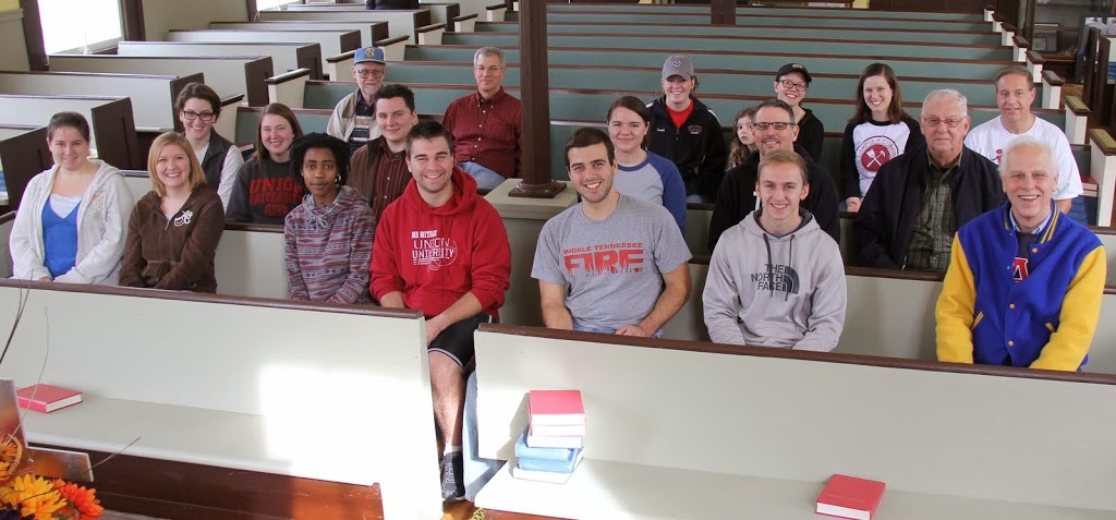 Participants in the Phi Alpha Theta/History Department-sponsored community service project in Denmark, Tennessee, join together for a photo in the sanctuary of the Denmark Presbyterian Church on November 4, 2014. They are: (front row, left to right) Faith Bagley, Hannah Jones, Brittanee Boler, Kenan Keller, Allen Bradley, Devin Dean, and Dr. Stephen Carls; (second row, left to right) Livvy Winters, Kathryn Mitchell, Nic Linn, Jordan Sellers, Dr. Keith Bates, and Billy King (the project host); (third row, left to right) Dr. Terry Lindley, Dr. David Thomas, Sarah Carroll, Rachel Bates, Bree McCuin, Kayla Ketner, and Dr. Henry Allen.