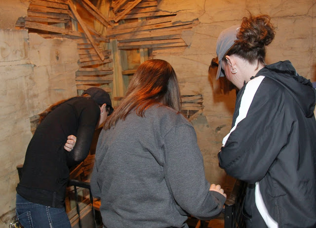 Union students look down a square-framed shaft to its base on the first floor of the Denmark Presbyteriand Church. The shaft (or pit) contains a steep ladder that was used as a part of an initiation ceremony for the Masonic Lodge located on the second floor of the church. The students are: (left to right) Bree McCuin, Kathryn Mitchell (wearing dark gray sweatshirt), and Sarah Carroll.