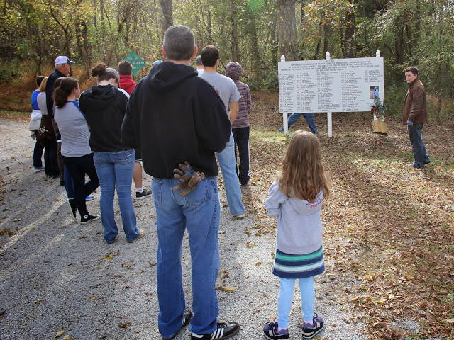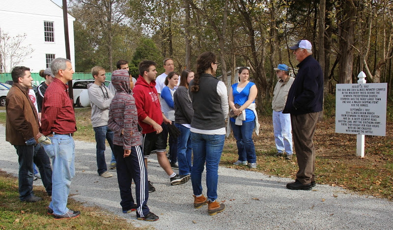Union community service project participants listen to Billy King (right), president of the Big Black Creek Historical Association, talk on November 4, 2014, about the the Civil War campsite of the 30th Illinois regiment located behind the Denmark Presbyterian Church. They are: (left to right) Nic Linn, Sarah Carroll (largely obscured), Dr. David Thomas, Devin Dean, Allen Bradley (standing beside Dean), Brittanee Boler (wearing dark blue warm-up pants wih white stripes), Kenan Keller, Dr. Henry Allen, Jordan Sellers, Kathryn Mitchell, Livvy Winters, Faith Bagley, and Dr. Terry Lindley.