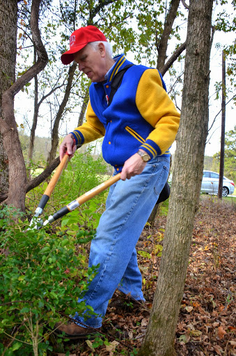 Dr. Stephen Carls cuts down brush behind the Denmark Presbyterian Church on November 4, 2014. He led a team of participants from Phi Alpha Theta and the history department in doing a community service project in Denmark, Tennessee, as a part of Union University's 12th annual Campus and Community: A Day of Remembrance and Service. Photo by Morris Abernathy