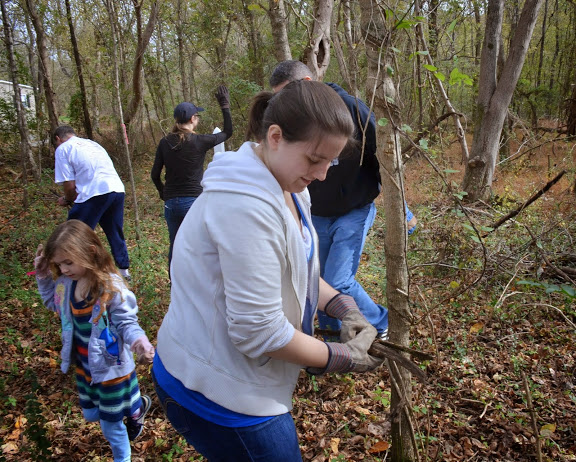 Senior history major Faith Bagley picks up debris at a Civil War campsite behind the Denmark Presbyterian Church on November 4, 2014. She was a participant in the Phi Alpha Theta/History Department service project that was a part of Union's annual Campus and Community: A Day of Remembrance and Service. On the left is Rachel Bates. Photo by Morris Abernathy