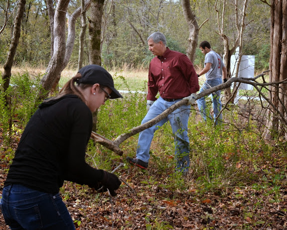 Bree McCuin (front left), Dr. Davis Thomas (center), and Allen Bradley (back right) help clear a Civil war campsite of tree branches and other debris as participants in the Phi Alpha Theta/History Department community service project in Denmark, Tennessee, on November 4, 2014. Photo by Morris Abernathy