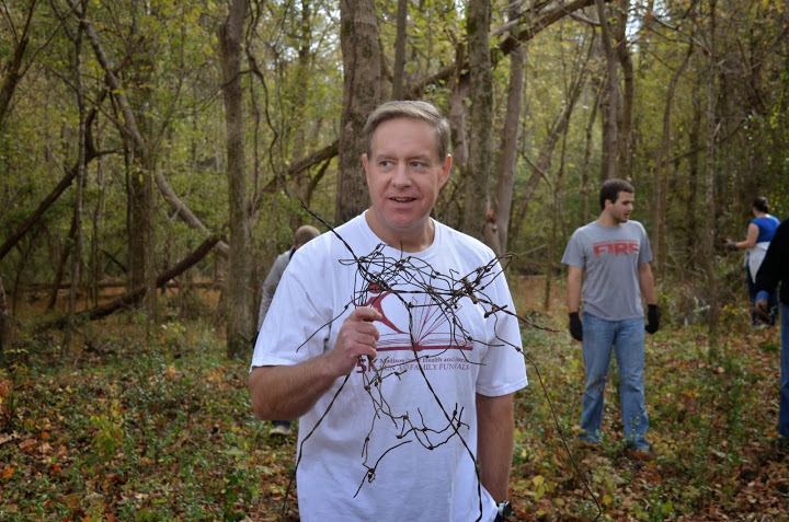 Dr. Henry Allen prepares to discard some old wire he found while helping clean up a Civil War campsite in Denmark, Tennessee, as part of a Phi Alpha Theta/History Department community service project on November 4, 2014. Phi Alpha Theta member Allen Bradley is behind him on the right. Photo by Morris Abernathy.