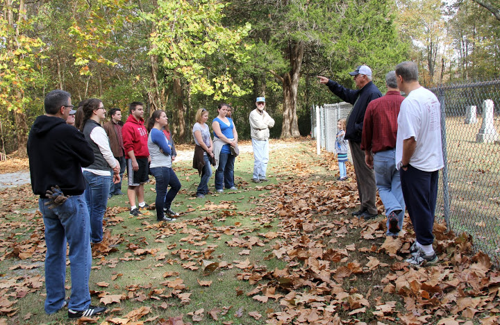 Billy King, president of the Big Black Creek Historical Association, talks about the Presbyterian cemetery in Denmark, Tennessee, on November 4, 2014, to participants in the Phi Alpha Theta/History Department community service project that was a part of Union's Campus and Community: A Day of Remembrance and Service. Participants visible in the photo are: (left to right) Dr. Keith Bates, Livvy Winters (with braided hair and glasses), Nic Linn, Kenan Keller, Jordan Sellers, Hannah Jones, Faith Bagley, Brittanee Boler, Dr. Terry Lindley, Rachel Bates, Billy King, Dr. David Thomas, and Dr. Henry Allen.