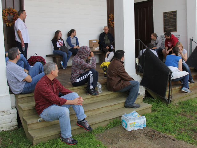 Billy King (seated on bench, just left of the pillar) tells a story about Denmark, Tennessee, on the front porch of the Denmark Presbyterian Church on November 4, 2014. Listening to him speak are (starting at the left and going clockwise) Dr. David Thomas (wearing red plaid shirt), Dr. Keith Bates, Dr. Henry Allen (standing), Kathryn Mitchell (seated on the bench), Jordan Sellers, Devin Dean (seated on the bench to the right), Kenan Keller, Hannah Jones, Faith Bagley (back to camera), Allen Bradley (wearing gray shirt with back to camera), Livvy Winters (resting against the church pillar and barely visible), Nic Linn (wearing brown jacket), and Brittanee Boler (wearing navy blue warm-up pants with whites stripes).
