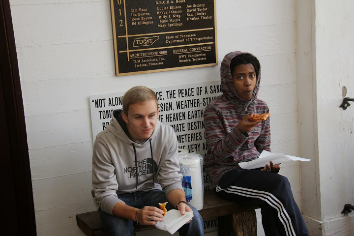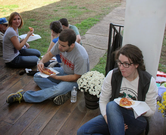 Participants in the Phi Alpha Theta/History Department community service project in Denmark, Tennessee, on November 4, 2014, enjoy pizza prior on the front porch of the Denmark Presbyterian Church prior to their return to Union's campus. The students facing the camera are: (left to right) Hannah Jones, Allen Bradley, and Livvy Winters.