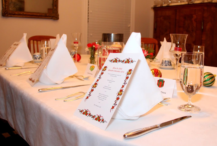 A dinner menu helps decorate each place setting at the Phi Alpha Theta/History Department French Christmas dinner at Dr. Stephen Carls's home on December 6, 2014.